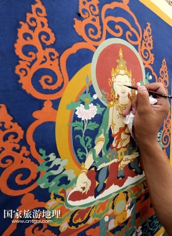 國(guó)家旅游地理 西藏拉薩8月4日訊 8月3日,一名畫師在現(xiàn)場(chǎng)演示唐卡繪制過程。當(dāng)日,第三屆西藏“唐卡藝術(shù)博覽會(huì)”在拉薩羅布林卡舉行,共展出89名優(yōu)秀畫師的230多幅精品力作。唐卡作為藏族特有的繪畫,有上千年的歷史,已成為藏族文化的“名片”,受到國(guó)內(nèi)外廣泛關(guān)注。 /新華社記者 覺果 攝