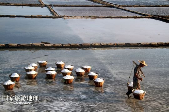 國家旅游地理 浙江臺(tái)州8月10日訊 8月10日,在浙江溫嶺市石塘鎮(zhèn)蒼岙鹽場(chǎng),一名鹽工頂著太陽在鹽田里把曬好的鹽收集起來挑到鹽堆去。連日來,浙江省溫嶺市石塘鎮(zhèn)蒼岙鹽場(chǎng)的鹽工利用晴熱天氣忙著曬鹽。對(duì)于浙江的曬鹽人來說,夏季陽光最猛烈的7月、8月、9月這三個(gè)月是他們勞作的黃金季節(jié)。天氣越炎熱,光照越猛烈,曬鹽效果就越好。炎熱的夏天艷陽高照,而曬鹽人卻要頂著高溫出門勞作。 /新華社發(fā)(梁敏慧 攝)