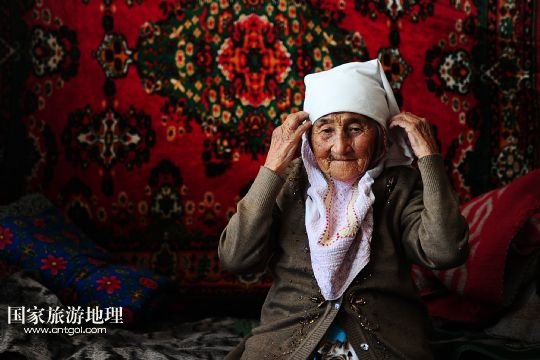 今年已經(jīng)90歲,同時(shí)也是馬海村年齡最大的村民哈麗麥在整理頭巾(8月11日攝)。