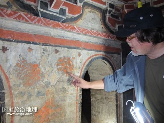 國家旅游地理 陜西延安9月15日訊 9月14日,考古學(xué)家正在查看畫像磚墓內(nèi)的壁畫。經(jīng)過近三個月的緊張工作,陜西省考古學(xué)家日前在陜西延安配合基建時,首次對一座宋金時期大型畫像磚墓進(jìn)行了科學(xué)考古發(fā)掘。發(fā)現(xiàn)這座畫像磚墓竟是仿木磚結(jié)構(gòu)多室墓,對了解和研究陜北畫像磚墓形制、建筑結(jié)構(gòu)及其分布與內(nèi)容等,具有重要的標(biāo)尺性意義。 /新華社記者馮國攝