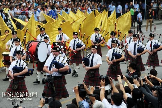 9月30日,蘇格蘭風笛樂團在廣西柳州市駕鶴路巡游。