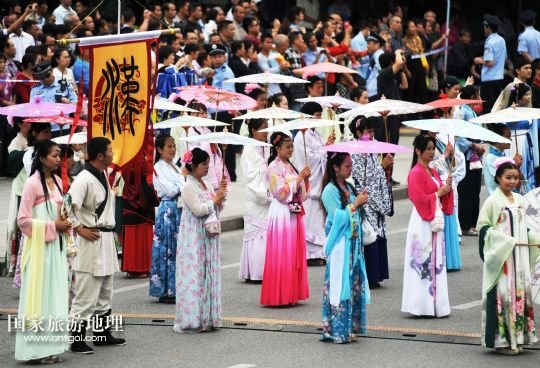 9月30日,巡游隊伍在廣西柳州市駕鶴路上展示漢服。