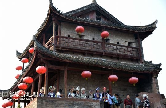 10月13日,來自湖南靖州苗族侗族自治縣的展演隊伍在鳳凰古城城樓上展示苗服。