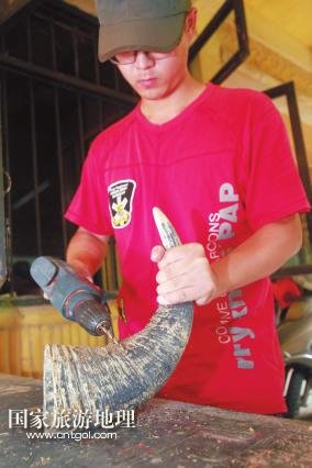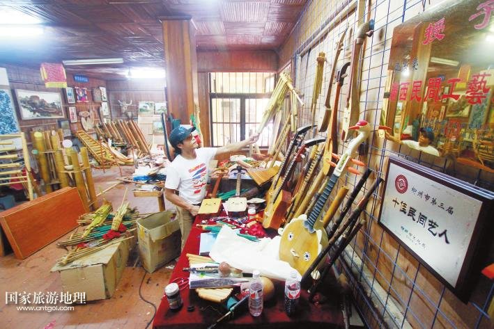 國家旅游地理 廣西柳州11月11日訊(記者陸旺楊春) 牽手漫步龍?zhí)睹琅希⒓缈勘炽逶⊥砬锱?,你會時常聽到一串串動人的音符:它時而渾厚圓潤、清脆響亮,時而輕靈縹緲、悠長凄美。不忍打破這份寂靜閑情,卻又忍不住猜想:這是何方人士,用何種樂器,吹拉彈撥出如此佳音?穿越叢林,循聲走去,瑤寨庭前,幾個年輕男女手握蘆笙,身子左搖右晃,吹得正起興。步入瑤寨一樓才發(fā)現(xiàn),這里儼然一個生產民族樂器的大工廠:木板、竹竿、鐵鋸、膠水、油漆,以及形狀酷似牛頭、牛腿、魚身、龍身等顏色各異、五花八門的樂器……一位正在給樂器上漆的中年人梁志榮告訴記者,這是龍?zhí)豆珗@正在籌建的民族樂器館,也是魚峰區(qū)創(chuàng)建廣西文化強區(qū)的特色景區(qū)之一,他現(xiàn)在是大龍?zhí)睹褡逅囆g團團長,研究、制作民族樂器將近20年,曾獲“廣西民間工藝大師”和“十佳民間藝人”稱號。