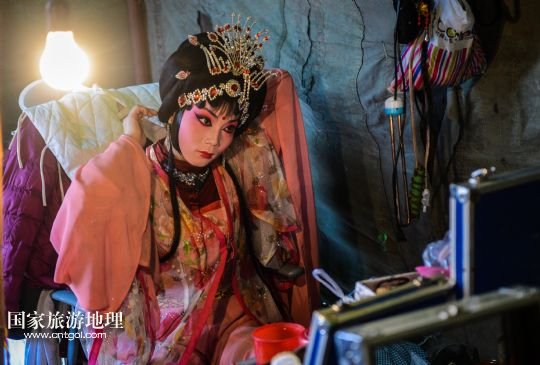 1月3日,武義壺山婺劇團(tuán)的演員在上臺(tái)前整理頭飾。