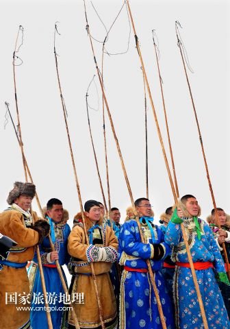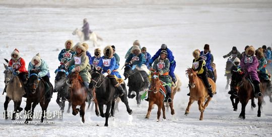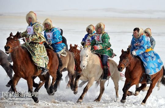 國家旅游地理 內(nèi)蒙古錫林郭勒1月5日訊 1月4日,牧民們在賽馬比賽中。當(dāng)日,2014年“銀色西烏珠穆沁”杰仁馬文化節(jié)在內(nèi)蒙古錫林郭勒盟西烏珠穆沁旗舉行。當(dāng)?shù)孛晒抛迥撩裆碇A麗的服飾,帶著自家的馬匹,冒著風(fēng)雪嚴(yán)寒,從四面八方趕到會場,參加了賽馬、套馬、乘馬拾物、蒙古馬選美等多項比賽,吸引了來自全國各地的游客、攝影愛好者以及附近的大批牧民。 /新華社記者任軍川攝