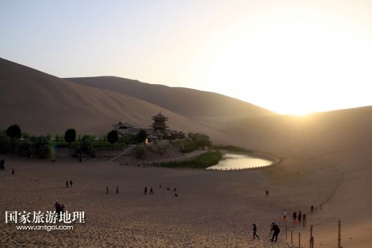 國(guó)家旅游地理 甘肅酒泉5月19日訊 夕陽(yáng)下的甘肅省敦煌市鳴沙山月牙泉顯得更加迷人(5月18日攝)。初夏時(shí)節(jié),甘肅省敦煌市鳴沙山月牙泉景區(qū)風(fēng)光秀美,吸引眾多中外游客前來觀光游覽。 新華社發(fā)(張曉亮 攝)