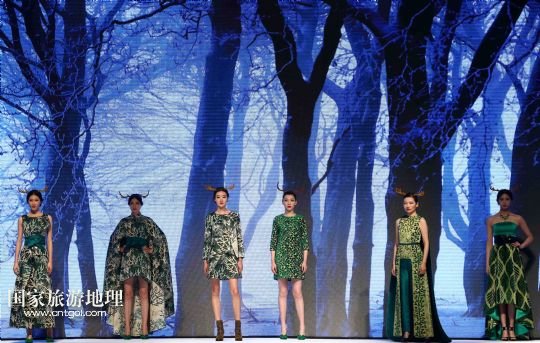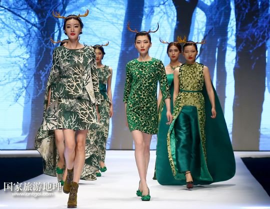 5月9日,模特在“2015杭州國際時尚周”開幕式上展示英國寶萊達(dá)服裝設(shè)計(jì)公司主題為“樹靈派對”的時裝。