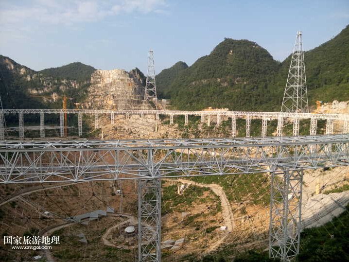 這是黔南平塘縣正在建設(shè)的大射電望遠鏡,也稱 FAST,預(yù)計將于明年九月建成。FAST具有中國獨立自主知識產(chǎn)權(quán),是世界上正在建造及計劃中的口徑最大、最具威力的單天線射電望遠鏡,其設(shè)計綜合體現(xiàn)了我國高技術(shù)創(chuàng)新能力。500米口徑球面射電望遠鏡是利用貴州喀斯特地區(qū)的洼坑作為望遠鏡臺址,建造世界第一大單口徑射電望遠鏡,其擁有30個標準足球場大的接收面積。FAST作為世界最大的單口徑望遠鏡,將在未來20至30年保持世界一流地位。