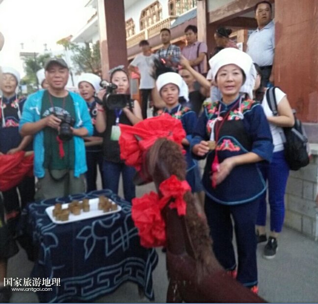 這是黔南惠水縣好花紅布依風(fēng)情寨,為了歡迎遠方客人的到來,布依族人在寨門前擺滿酒杯唱起山歌。在進寨前客人都要喝三杯攔門酒,喝完才能進入寨中。同時,布依族習(xí)俗中,遠方客人到來,坐上木馬,喝完三杯米酒也寓意著會交好運。