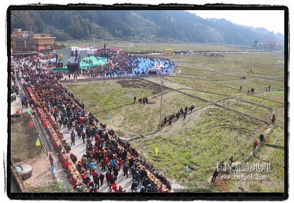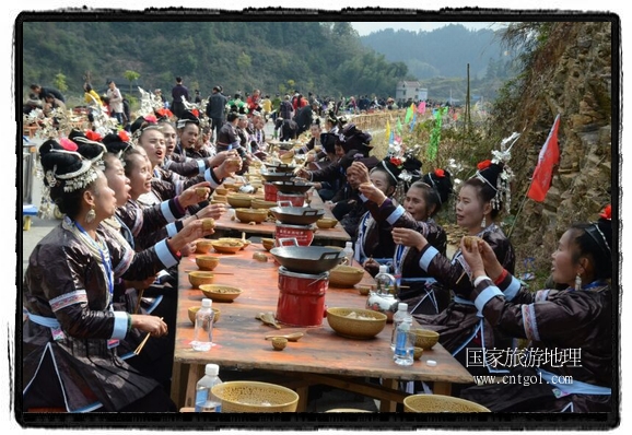 今年黎平侗年節(jié),除了延續(xù)亙古以來老百姓過侗年的各項傳統(tǒng)習(xí)俗活動外,還有“天下侗家年”大型侗族史詩情景歌舞展演、侗族萬人長桌宴、招商引資推介會、七彩田園采摘體驗、百村集市商品展銷、侗文化研討會、楊再思文化交流研討會等多項主題活動,其中,主打主推的“最大合攏宴”(萬人長桌宴)品牌,得到基尼斯紀(jì)錄總部到現(xiàn)場認定,以1700桌合攏宴,總長3.7公里,10380人同桌就餐,創(chuàng)歷史之最,成功載入《基尼斯紀(jì)錄大全》,吸引數(shù)萬旅游客到場親自見證、參與、感受和體驗這一千載難逢,氣勢恢宏的盛況。